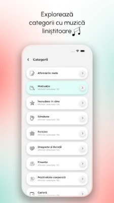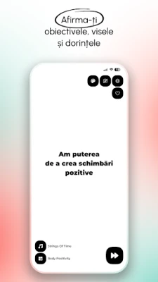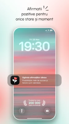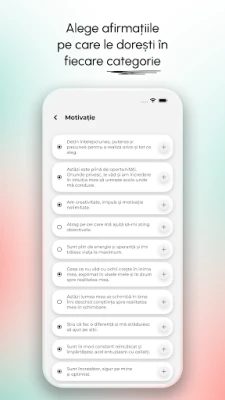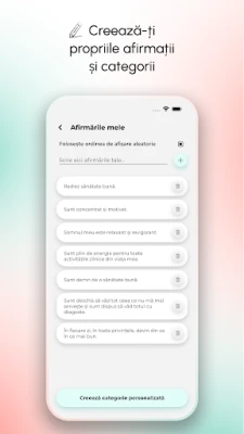 Indiferent de starea ta de spirit sau de aspirațiile tale, vei găsi îndrumare prin categoriile diverse, de la sănătate și motivație la iubire de sine și succes, fiecare adaptată pentru a-ți oferi exact impulsul de care ai nevoie. Pentru a personaliza și mai mult parcursul, poți alege din colecția de fundaluri estetice și, mai mult, ai libertatea de a-ți compune propriile afirmații, organizându-le în categorii personalizate. Notificările programate zilnic sunt concepute să te inspire și să te mențină conectat cu intențiile tale, transformând gândirea pozitivă într-un obicei. Prin această abordare consecventă, Oglinda afirmațiilor zilnice te sprijină să îți manifești obiectivele și să construiești o realitate conformă cu cele mai profunde dorințe ale tale, consolidându-ți fericirea și bunăstarea.
