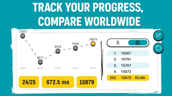 Indiferent dacă ești un gamer care dorește o țintire mai rapidă și o luare mai bună a deciziilor, un atlet care își antrenează agilitatea și concentrarea, sau pur și simplu cineva curios despre potențialul său cognitiv, FLX este instrumentul ideal. Urmărește-ți progresul detaliat în timp și compară-ți performanțele cu cele ale jucătorilor din întreaga lume prin intermediul clasamentului global. Este o modalitate excelentă de a-ți stimula competitivitatea și de a te menține motivat în călătoria ta către reflexe superioare.