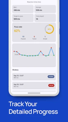 Progresul tău este la fel de important ca antrenamentul. **Reaction Time: Reflex Test** îți pune la dispoziție un tablou de bord statistic detaliat, unde poți analiza performanțele, vizualiza timpii medii și cele mai bune scoruri pentru fiecare exercițiu. Istoricul complet al încercărilor și graficele intuitive îți permit să observi evoluția și să-ți stabilești noi ținte, transformând efortul în rezultate concrete. Dincolo de ecran, această pregătire cognitivă se traduce în beneficii palpabile: o concentrare sporită, o coordonare ochi-mână îmbunătățită și o agilitate mentală superioară, esențiale în sport, gaming competitiv și chiar în activități zilnice precum condusul. Este antrenamentul ideal pentru a-ți încălzi mintea înainte de orice provocare, oferind o experiență de antrenament curată și fără distrageri, într-un design minimalist.