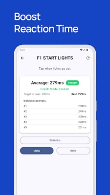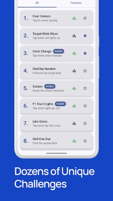Colecția diversificată de provocări din **Reaction Time: Reflex Test** este special creată pentru a testa și a îmbunătăți diverse abilități. De la clasicul „F1 Start Lights", unde viteza ta pură de reacție este pusă la încercare în momentul stingerii luminilor, la „Swipes" care îți evaluează rapiditatea deciziilor și coordonarea ochi-mână. Explorează „Color Choice", inspirat de efectul Stroop, pentru a-ți accelera procesarea informațiilor, sau „Odd One Out" pentru a-ți perfecționa concentrarea vizuală. Nu lipsesc exerciții precum „Moving Ball" pentru acuratețea motorie, „Line Cross" pentru sincronizare, sau „Reaction Chain" pentru secvențe rapide, alături de multe alte provocări inedite, precum Four Corners sau Target Blink Maze, garantând un antrenament complet și captivant.